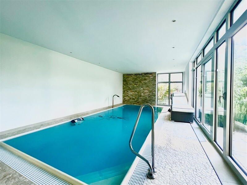 Erdgeschoss mit Schwimmhalle:Diele, Garderobe, Gäste-WC, Ruheraum, großes Schwimmbad mit elektrischer Fußbodenheizung und im Pool mit Luftsprudelanlage und Unterwasser Farbillumination, erstklassige Küche mit angrenzender Speisekammer, großzügiges Wohn- & Speisezimmer mit Zugang zur Sonnenterrasse, modernes Arbeitszimmer