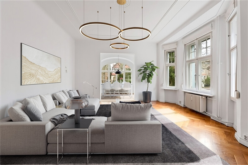 ( ca. 150 qm Wfl.) große Diele, herrschaftliches Wohn und Speisezimmer, Arbeitszimmer, herrschaftliches Kinderzimmer, Badezimmer, kleine Küche, Abstellraum, gut geschnittenes Schlafzimmer, Badezimmer und Ankleidezimmer