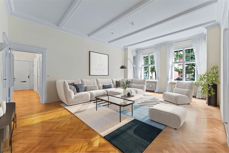 Beletage/ Erdgeschoss:Windfang, stilvoller Empfang mit Aufgang zum Obergeschoss, Gäste-WC, geräumiges Wohnzimmer, stilvolles Speisezimmer, großzügige Wohnküche, Bibliothek