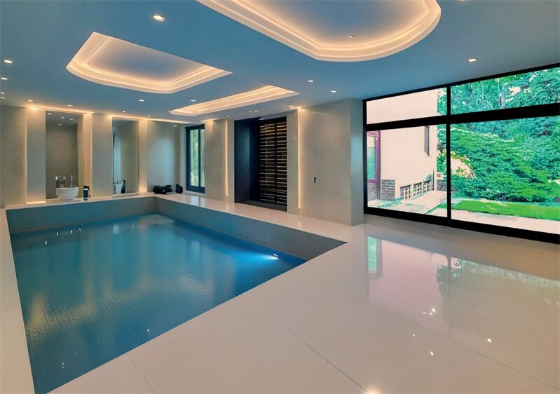 Erdgeschoss:lichtdurchfluteter Empfang, Abstellkammer, Garderobe, Gäste-WC, offene Wohnküche, großes Schwimmbad, großes Wohn- und Speisezimmer, Bibliothek